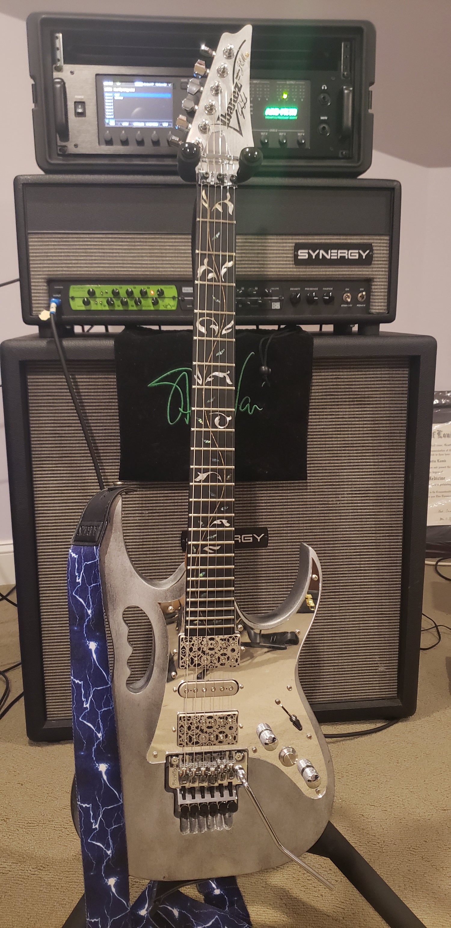 This is a REMARKABLE amp. It's the Synergy Syn50 Head with two modules, the Vai Module and the Freidman BE-BB. I spend the majority of my time in the Vai module... This isn't modeling, at all. It is completely tube driven. When Carvin stopped making amps, Vai found Synergy and developed his newest "Legacy" iteration. It is the tone you hear on my album, "This is Only a Test." Of course, my tone is completely different from Vai's, but his module can get you the sound you want!!! https://www.synergyamps.com/